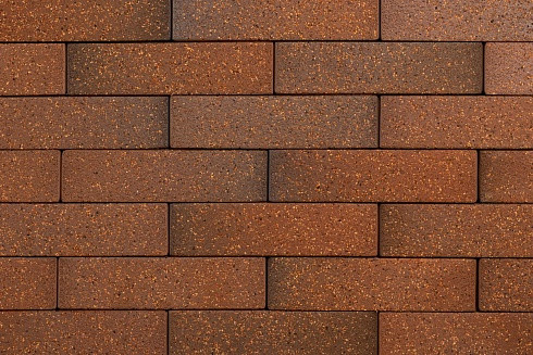 Кирпич имеет абразивную лицевую поверхность, образованную нанесенной минеральной крупкой и характерными углублениями в местах ее частичного удаления. В основе паттерна теплые оттенки от коричневого до темно-коричневого. Дополняет их равномерное вкрапление контрастных частиц бежевого, пшеничного и кофейного оттенков. Вес 1,6-1,8 кг/шт