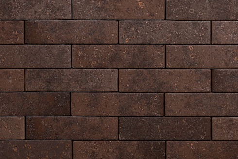 Кирпич имеет гладкую матовую лицевую поверхность с мелкорельефными углублениями произвольной формы. Присутствует легкий перламутровый блеск. В основе паттерна холодные оттенки от темно-коричневого до кофейно-коричневого. Вес 2,4-2,7 кг/шт