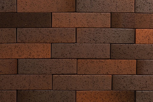 Кирпич имеет выраженную абразивную лицевую поверхность, образованную нанесенной минеральной крупкой и характерными углублениями в местах ее частичного удаления. В основе паттерна чередование теплых и холодных оттенков от коричневого до темно-коричневого. Дополняет их равномерное вкрапление контрастных частиц кофейного оттенка. Вес 2,4-2,7 кг/шт